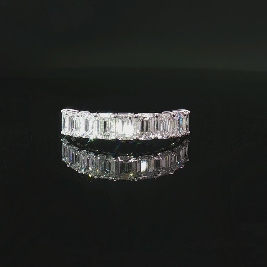 Adorn your hand with the sophisticated LGR053 Emerald Cut Half Eternity Wedding Ring from Roselle Jewelry. This stunning ring features 2.05 carats total weight of exquisite emerald cut diamonds, meticulously set in a captivating half-eternity design. Perfect as a wedding band or a luxurious anniversary gift, its elegant lines and brilliant sparkle offer a timeless symbol of enduring love and refined taste.